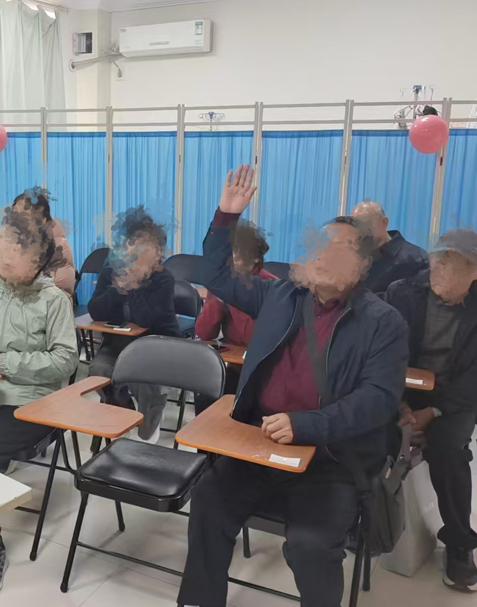 与此同时,肾病内分泌科为住院患者精心组织的糖尿病知识有奖竞猜活动热闹开场。竞猜题目涵盖血糖监测技巧、饮食禁忌、运动方法、并发症防治等实用内容,既兼顾专业性又不失趣味性。患者们踊跃举手、积极抢答,现场不时响起阵阵掌声与欢笑声。大家在轻松愉悦的氛围中巩固了糖尿病管理知识,答对题目的患者还收获了定制健康礼品,脸上洋溢着满满的成就感。